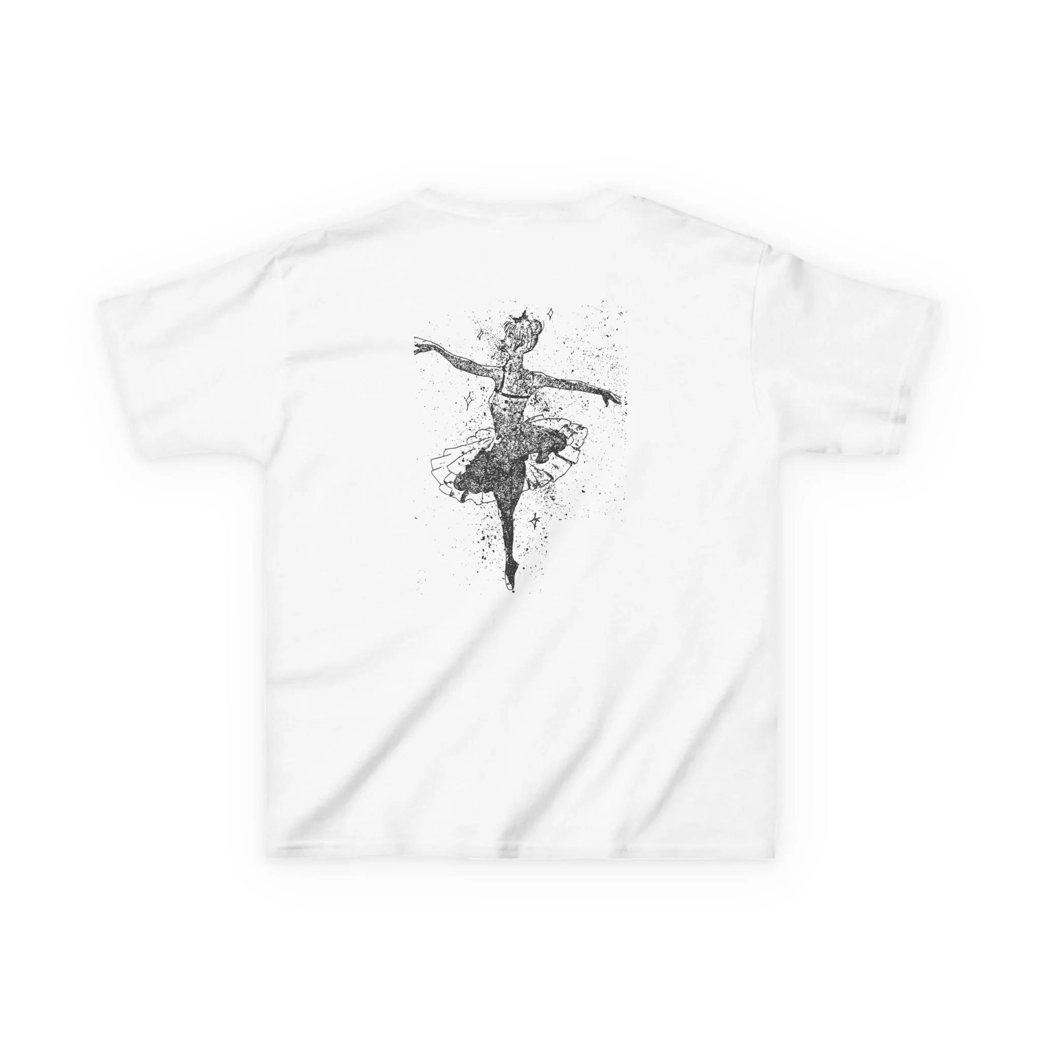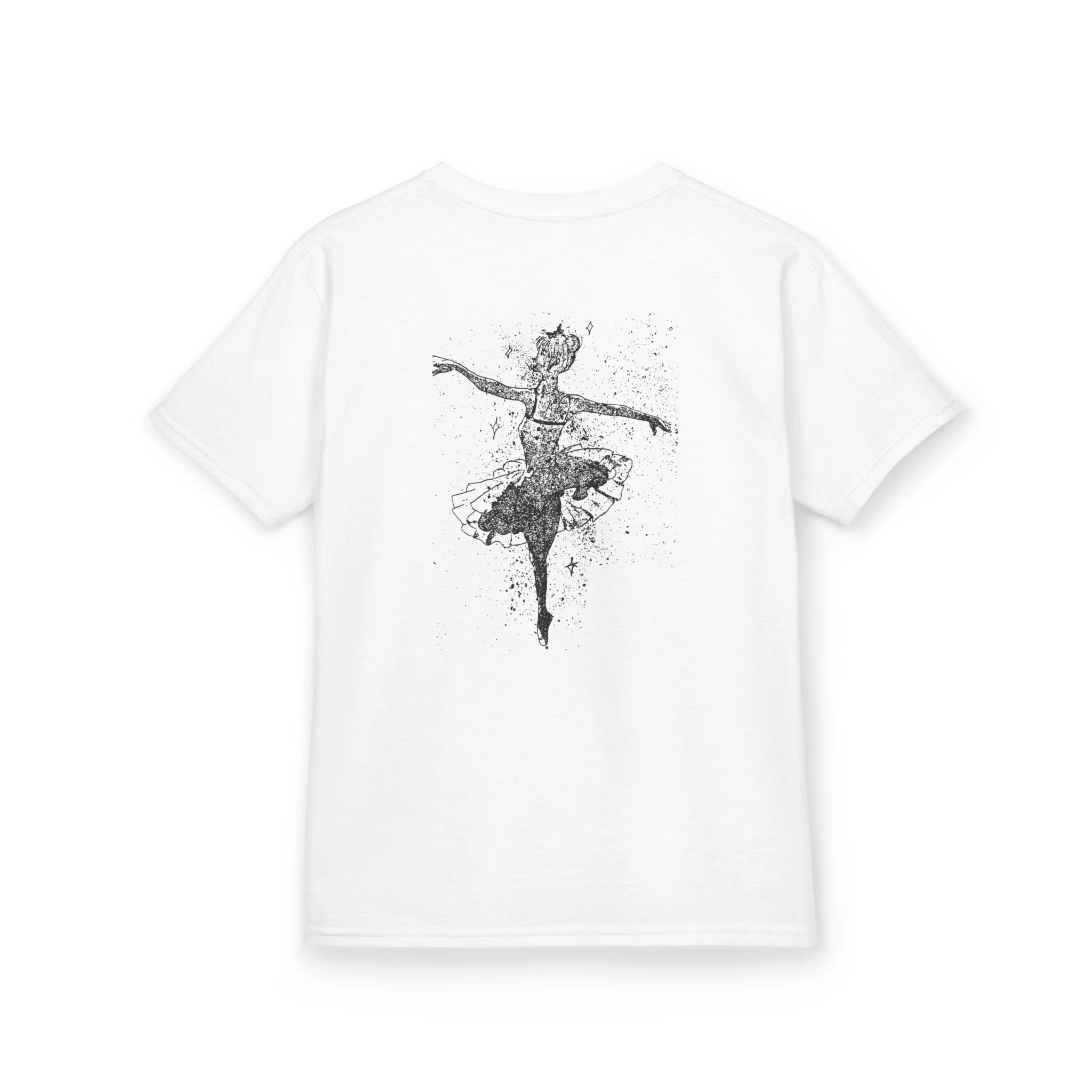 Soft midweight cotton, a whisper of motion: this kids tee carries a delicate black ink ballerina across the back and a tiny handwritten word on the chest. It feels breathable and familiar — the kind of shirt a child reaches for on dance class days or when they want to move freely at home. The classic crew neck and straight cut keep the silhouette simple so the art can breathe. Lightly textured printing gives the illustration a hand-sketched look, so every twirl reads like a captured moment.
